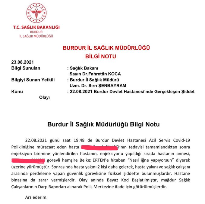 Sağlık Bakanı Fahrettin Koca, yaşanan olayın ardından hazırlanan raporu sosyal medya hesabından paylaşarak, "Bir sonraki hastayla ilgilenmek yerine darp raporu hazırlatmak? Hasta şikâyeti dinlemek yerine polis merkezine ifade için gitmek? Açıklanabilir yanı yok. Toplum bizimle. Adaletin takipçisiyiz. Aşağıdaki rapor, Burdur İl Sağlık Müdürlüğümüzden geldi. Yargıya, 84 Milyona sunuyorum." açıklamasında bulundu.