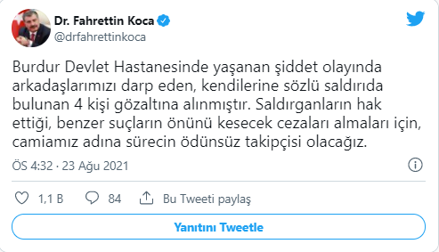 Bakan Koca, "Burdur Devlet Hastanesinde yaşanan şiddet olayında arkadaşlarımızı darp eden, kendilerine sözlü saldırıda bulunan 4 kişi gözaltına alınmıştır. Saldırganların hak ettiği, benzer suçların önünü kesecek cezaları almaları için, camiamız adına sürecin ödünsüz takipçisi olacağız." dedi.