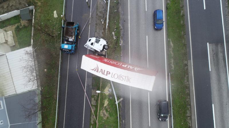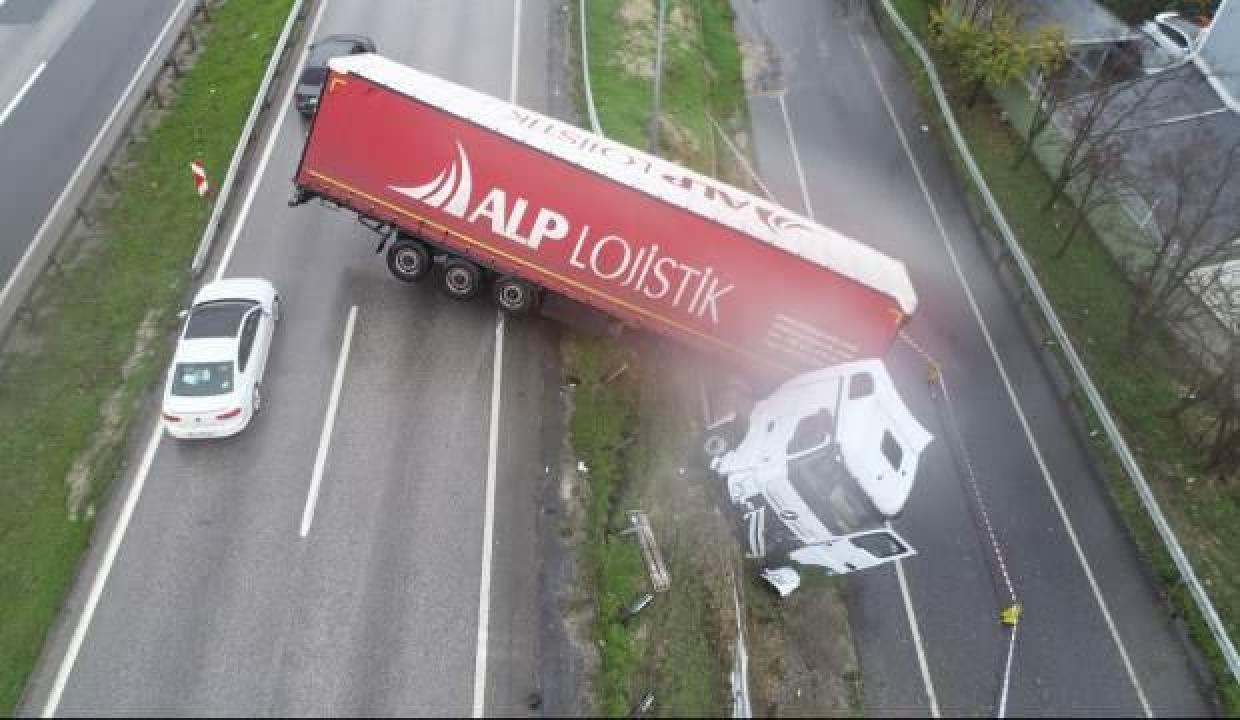 Kaza saat 13.00 sıralarında D-100 Karayolu Büyükçekmece Kumburgaz mevkii Ankara istikametinde meydana geldi. Edinilen bilgiye göre, 34 FN 8824 plakalı TIR sürücüsü İbrahim K. yağmurlu havada kayganlaşan yolda direksiyon hakimiyetini kaybedip bariyerlere çarparak yoldan çıktı. Bir süre bariyerleri kırarak sürüklenen TIR, D-100 ile yanyol arasında askıda kalarak durabildi.