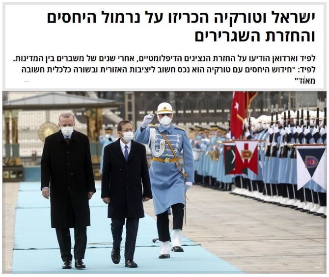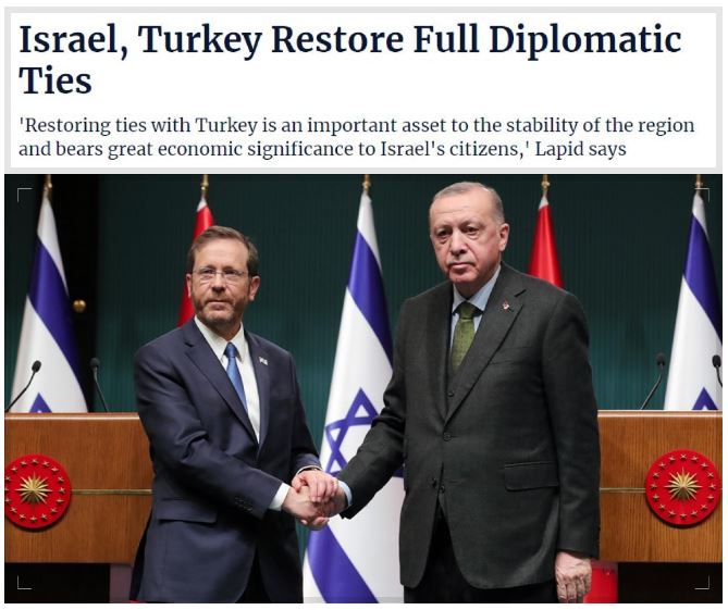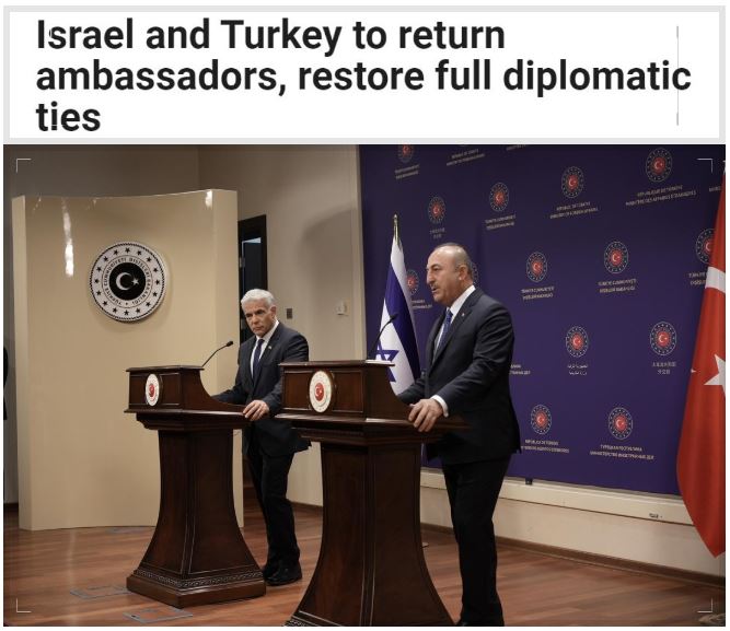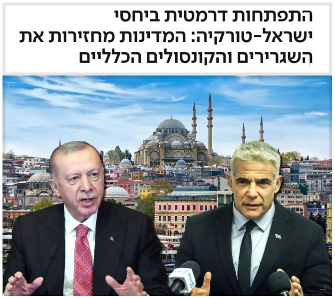 Haberde, "Başbakan Yair Lapid ile Türkiye Cumhurbaşkanı Recep Tayyip Erdoğan arasındaki görüşmenin ardından İsrail ve Türkiye, büyükelçi ve başkonsolosları görevlerine dönüyor." denildi.