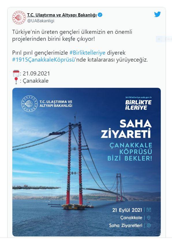 Avrupa ve Asya kıtalarını birleştirecek olan 1915 Çanakkale Köprüsü'nde tarihi an gerçekleşecek. Köprüden Ulaştırma ve Altyapı Bakanı Adil Karaismailoğlu yürüyerek geçecek.