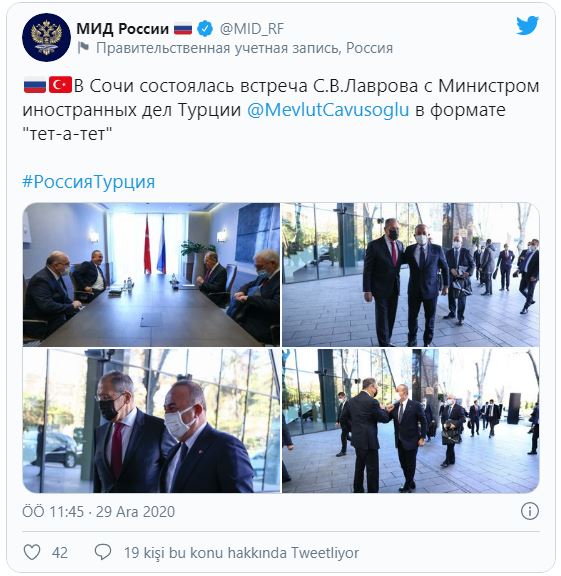 Türkiye Dışişleri Bakanı Mevlüt Çavuşoğlu ve Rusya Dışişleri Bakanı Sergey Lavrov'un görüşmesine ait fotoğraflar, Rusya Dışişleri'nin Twitter hesabı üzerinden paylaşıldı.