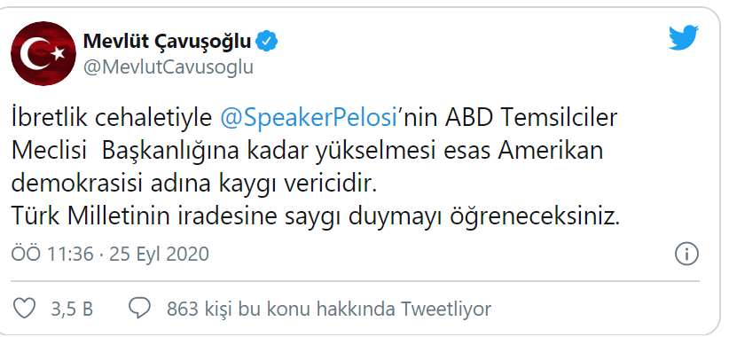 "İbretlik cehaletiyle @SpeakerPelosi’nin ABD Temsilciler Meclisi Başkanlığına kadar yükselmesi esas Amerikan demokrasisi adına kaygı vericidir. Türk Milletinin iradesine saygı duymayı öğreneceksiniz."