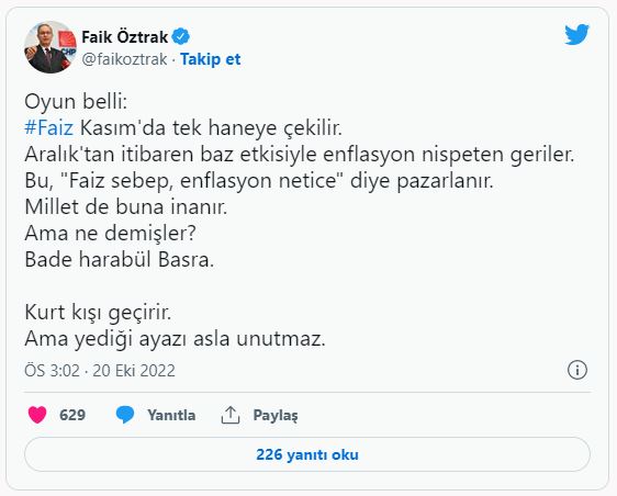 Öztrak; "Oyun belli: Faiz Kasım'da tek haneye çekilir. Aralık'tan itibaren baz etkisiyle enflasyon nispeten geriler. Bu, "Faiz sebep, enflasyon netice" diye pazarlanır. Millet de buna inanır. Ama ne demişler? Bade harabül Basra. Kurt kışı geçirir. Ama yediği ayazı asla unutmaz." ifadelerini kullandı.