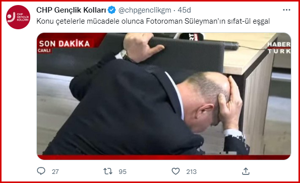 CHP Gençlik Kolları, Twitter hesabından Bakan Soylu'nun tatbikat esnasındaki fotoğrafıyla birlikte "Konu çetelerle mücadele olunca Fotoroman Süleyman'ın sıfat-ül eşgal" paylaşımı yapıldı.
