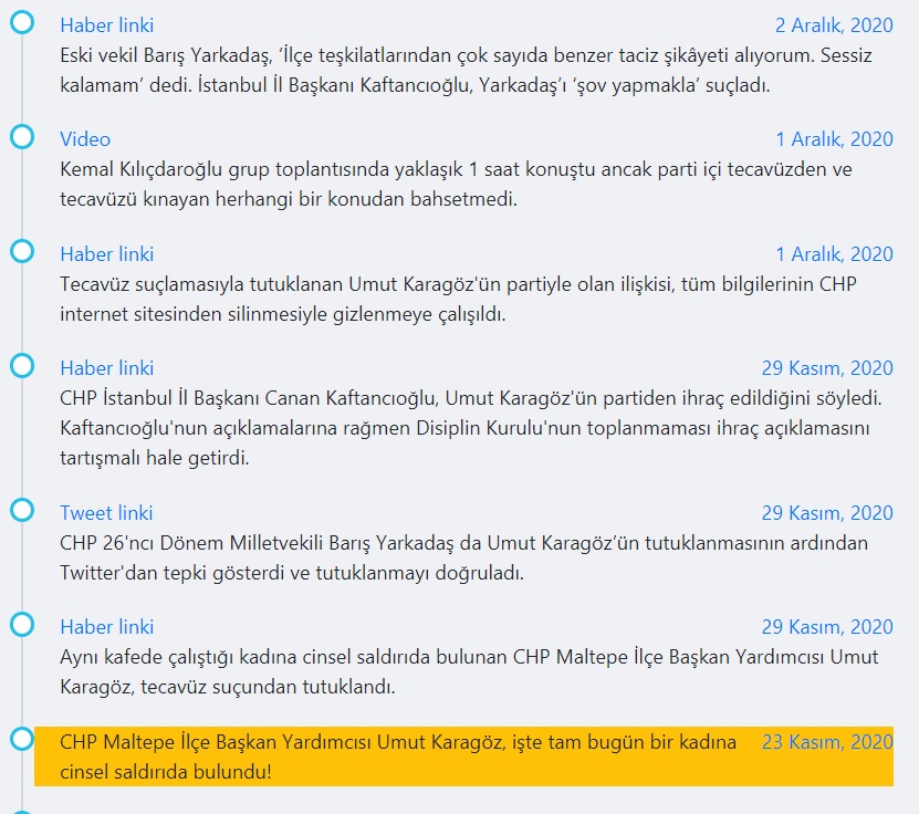 Sitede, CHP içinde yer alan bütün rezaletler bir bir sıralanıyor. Burada, CHP Maltepe İlçe Başkan Yardımcısı Umut Karagöz'ün, genç bir kıza cinsel saldırıda bulunmasından, eski CHP'li vekil Barış Yarkadaş'ın, teşkilatan çok sayıda taciz şikayetleri almaya başladığını ve CHP İstanbul İl Başkanı Canan Kaftancıoğlu'nun da bu sebeple kendisini 'şov yapıyor' diye suçlamasına kadar bütün detaylar yer aldı.