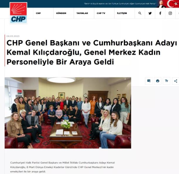 Görüşme, CHP’nin resmi internet sitesinden “Cumhuriyet Halk Partisi Genel Başkanı ve Millet İttifakı Cumhurbaşkanı Adayı Kemal Kılıçdaroğlu, 8 Mart Dünya Emekçi Kadınlar Günü’nde CHP Genel Merkezi’nin kadın emekçileri ile bir araya geldi.” ifadeleriyle paylaşıldı. Kemal Kılıçdaroğlu’nun CHP merkezindeki kadın çalışanlarla görüşmesine dair 17 adet fotoğraf servis edildi.