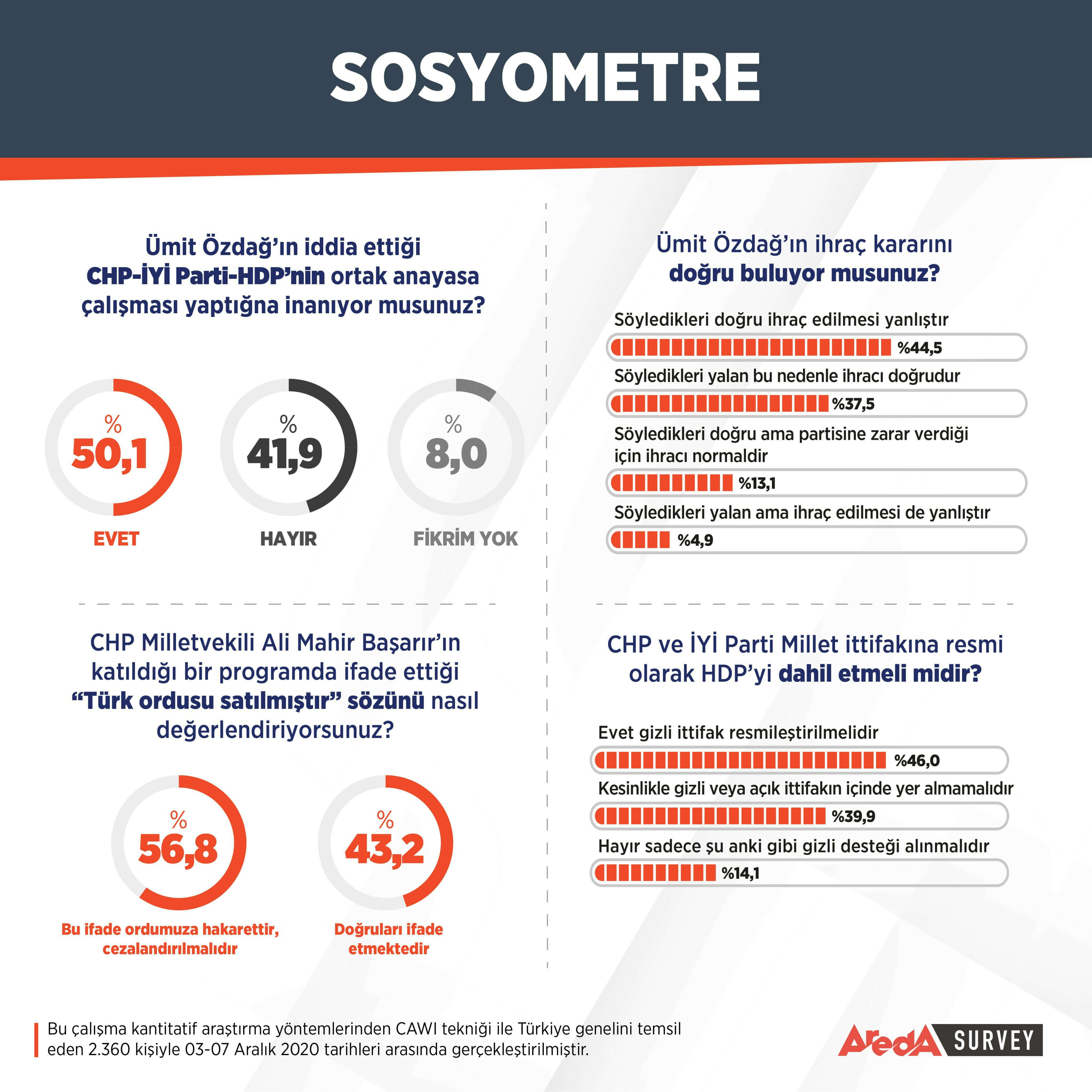 Araştırma şirketi Areda Survey, söz konusu iddiayı Türk halkına sordu ve araştırma sonuçlarında vatandaşların, Ümit Özdağ'ın iddialarına inandığı ortaya çıktı. "CHP-İYİ Parti-HDP'nin ortak bir şekilde anayasa çalışması yaptığına inanıyor musunuz?" sorusuna yanıt veren vatandaşların yüzde 50,1'i "evet" yanıtını verdi.