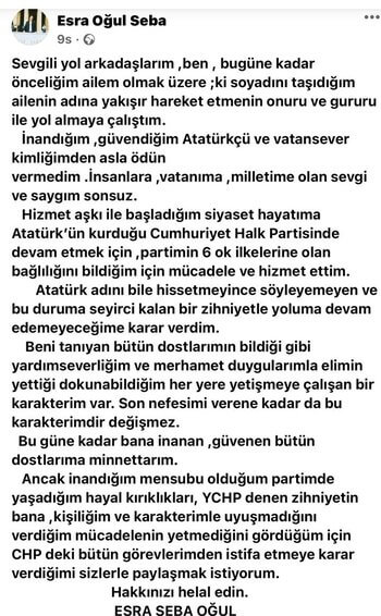 Bugüne kadar kendisine inanan ve güvenen tüm dostlarına minnettar olduğunu duyuran Esra Seba, CHP zihniyetinin kendisinin kişiliği ve karakteri ile uyuşmadığını kanaat getirerek partide bulunan tüm görevlerinden istifa etmeye karar verdiğini ifade etti. Esra Saba, helallik isteyerek yazısını sonlandırdı.