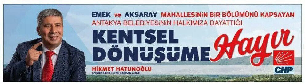 CHP’nin 31 Mart 2019’da yapılan yerel seçimlerde şu anki mevcut Belediye Başkanı AK Partili İzzettin Yılmaz’ın karşısına çıkardığı Antakya Belediye Başkanı Adayı Hikmet Hatunoğlu, önümüzdeki seçimde Hatay’dan milletvekili adayı olarak gösterildi. Hikmet Hatunoğlu’nun 4 yıl önceki afişlerinde “Kentsel dönüşüme hayır” sloganına yer verdiği görüldü.