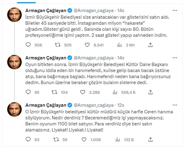 "İzmir Büyükşehir Belediyesi 'Size Anlatacaklarım Var' gösterisini satın aldı. Biletler 45 saniyede bitti. Instagramdan milyon “hakarete” uğradım. Gösteri günü geldi. Salonda olan kişi sayısı 80. Bütün profesyonelliğimle işimi yaptım. 2 saat gösteri yapıp sahneden indim.