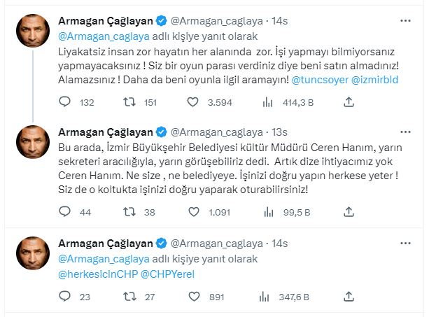 Armağan Çağlayan Twitter paylaşımlarına İzmir Büyükşehir Belediyesi'ni ve Belediye Başkanı Tunç Soyer'in hesaplarını da etiketledi.