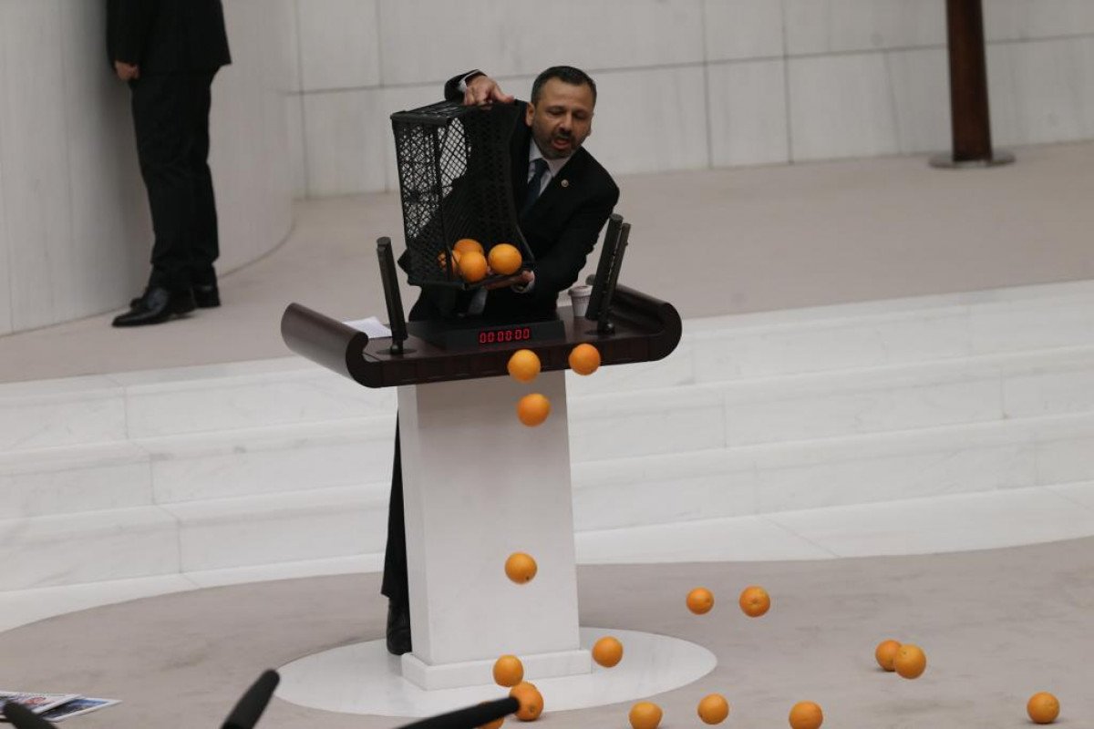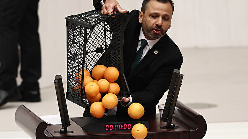 CHP Muğla Milletvekili Burak Erbay, TBMM Genel Kurulu'nda Cumhurbaşkanlığının 2022 yılı bütçe görüşmelerinde kürsüye bir kasa portakal ile çıktı.