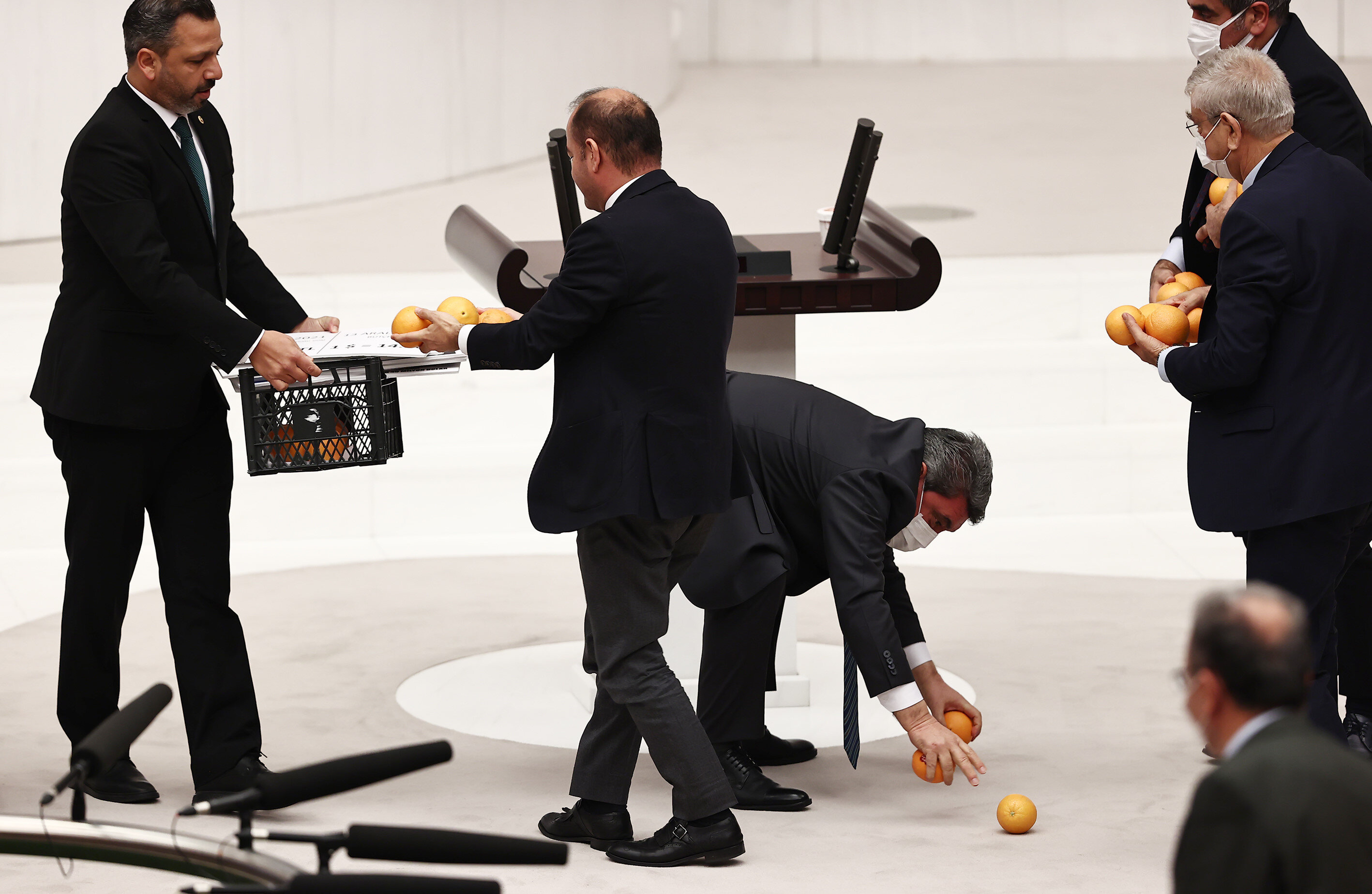 Erbay, konuşmasının ardından portakalları kürsüye döktü. Meclis Başkan Vekili Celal Adan, Erbay’ı uyararak “Bu yaptığınız doğru değil.” dedi. CHP milletvekilleri Erbay’ı alkışlarken, AK Parti milletvekilleri de duruma tepki gösterdi.