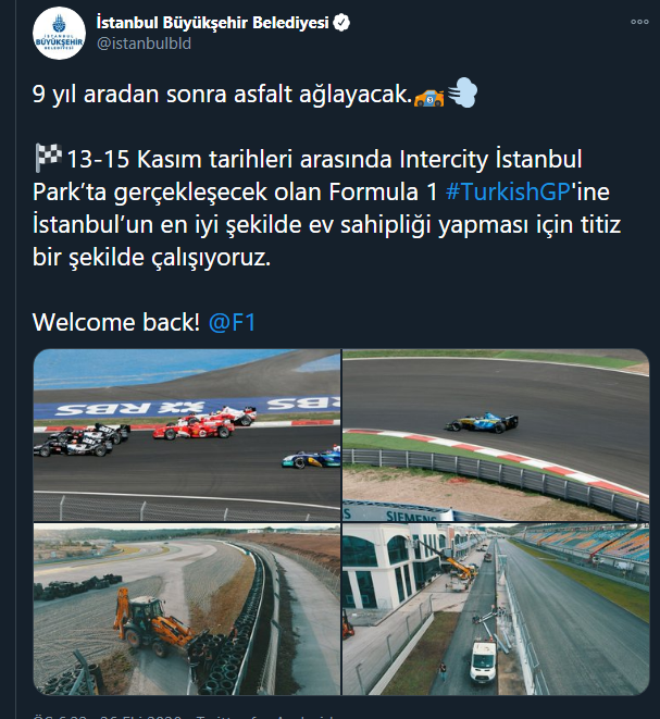 Resmi Twitter hesabı üzerinden yapılan paylaşımda, "9 yıl aradan sonra asfalt ağlayacak. 13-15 Kasım tarihleri arasında Intercity İstanbul Park’ta gerçekleşecek olan Formula 1 TurkishGP'ine İstanbul’un en iyi şekilde ev sahipliği yapması için titiz bir şekilde çalışıyoruz." ifadelerini kullanan İBB bir kez daha emek hırsızlığı yaptığını tescillemiş oldu.