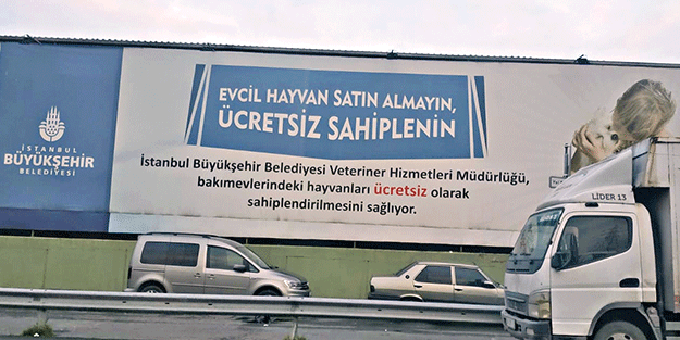 Geçtiğimiz hafta topladıkları sokak köpeklerini Kocaeli’nin Gebze ilçesinde terk ederken suçüstü yakalanan İBB ekipleri, çareyi Ekrem İmamoğlu yönetimindeki İstanbul Büyükşehir Belediyesi Veteriner İşleri Müdürlüğünde buldu. Barınaklardaki sokak hayvanlarını sahiplendirme kampanyası adı altında kurtarma operasyonu başlatan Veteriner İşleri Müdürlüğü, İstanbul’un muhtelif köşelerine asılan “Evcil Hayvan Satın Almayın Ücretsiz Sahiplenin” başlıklı devasa ilanlarla, İstanbulluları sokak hayvanlarını sahiplenmeye teşvik ediliyor.