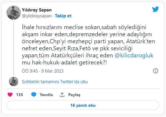 CHP'li eski Milletvekili Yıldıray Sapan, Kılıçdaroğlu'nu FETÖ ve PKK seviciliği yapmak, depremzedeler yerine adaylığını öncelemek ve ihale hırsızlarını Meclis'e sokmakla suçladı.
