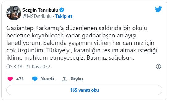 Türkiye'nin Suriye'nin Pençe Kılıç Hava Harekatı'nı başlatmasından sonra ilk tepkisi merak edilen CHP İstanbul Milletvekili Sezgin Tanrıkulu, Gaziantep'teki saldırıdan sonra paylaşım yaptı.