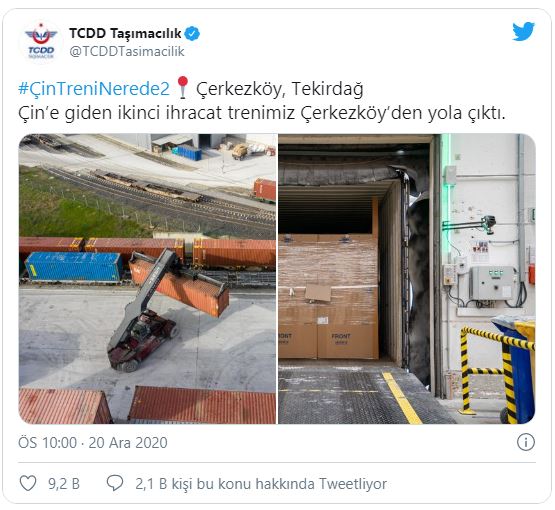 Türkiye Cumhuriyeti Devlet Demiryolları, Twitter hesabı üzerinden yaptığı paylaşımda, ilk trenden sonra ikinci ihracat treninin de Çin'e doğru yola çıktığını belirtti. Gelen bilgilere göre ikinci tren Tekirdağ'ın Çerkezköy ilçesinden yola çıktı.