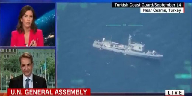 Miçotakis'in konuşması sırasında ekrana, Yunan Sahil Güvenliğinin göçmenleri geri ittiği, Türk Sahil Güvenliği'nin ise ölüme itilen göçmenleri kurtardığı anlar yansıdı.