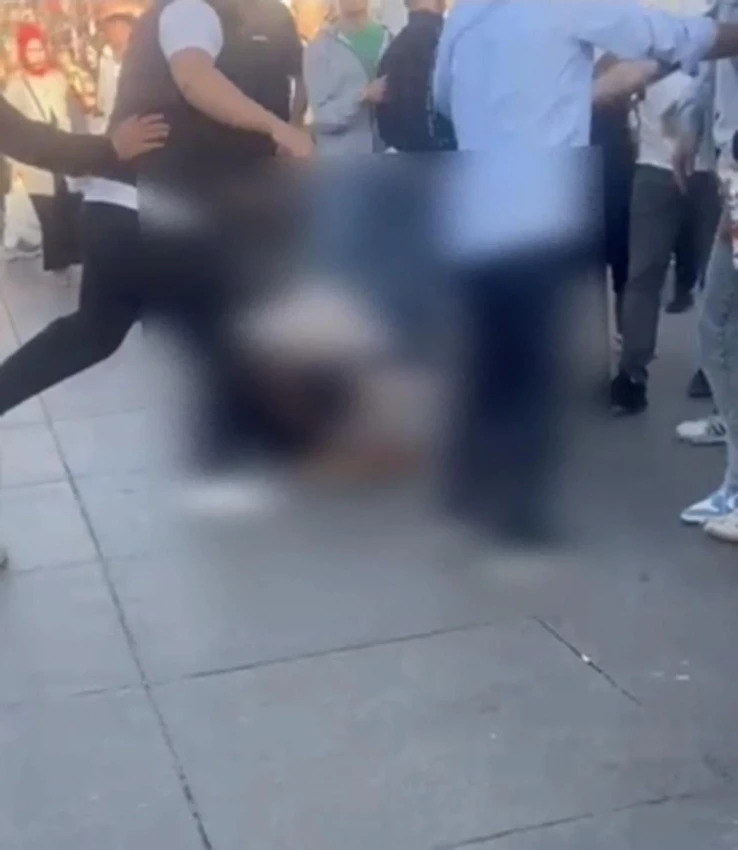 Görüntülerde, kızın 'Ben 16 yaşındayım' diyerek tepki gösterdiği duyulurken yere düşen şüphelinin uzun süre tekmelendiği anlar yer aldı.