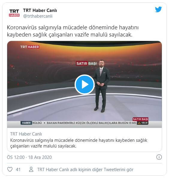 TRT Haber tarafından aktarılan bilgiye göre, yayımlanan genelge çerçevesinde sağlık çalışanları bundan böyle koronavirüs hastalığından vazife malulü oalarak sayılacak. Koronavirüs tanısı koyulan ve hayatını kaybeden sağlık personelinin yakınlarına aylık bağlanacak. Vefat eden sağlıkçının aileleri bundan böyle istihdam ve ek ödeme gibi haklardan yararlanabilecek.