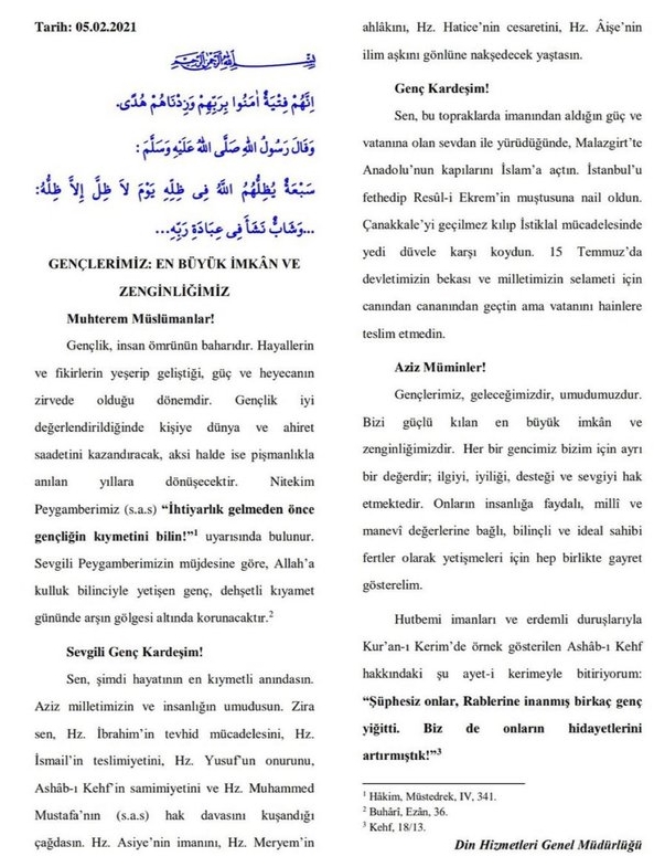 Din Hizmetleri Genel Müdürlüğü tarafından hazırlanan ve 5 Şubat 2021 tarihinde camilerde okunan "Gençlerimiz: En Büyük İmkan Ve Zenginliğimiz" başlıklı Cuma hutbesi şöyle: