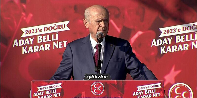 Bahçeli, "Türkiye'yi geri götürmeye kimsenin gücü yetmeyecektir. Cumhur İttifakı sınır ötesinde terörün başını esen mücadeledir. Cumhur İttifakı Türkiye'ye sahip çıkan inanmışlıktır. Cumhur İttifakı vatandır. Bizim zillete düşürecek bir ülkemiz yoktur. Bizim inançlarımıza sövenlere tahammülümüz yoktur. Çürük şarkıcılara, kiralık kalemlere tavizimiz yok. Çağrımız önce ülkem ve milletim diyen herkesedir. Biz birlikte Türkiye'yiz diyen herkes bu ülkenin öz evladıdır." dedi.