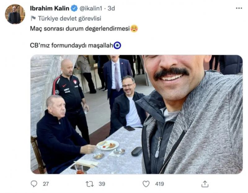 Cumhurbaşkanlığı Sözcüsü İbrahim Kalın çektiği fotoğrafı "Maç sonrası durum değerlendirmesi. CB’mız formundaydı maşallah" notuyla paylaştı.