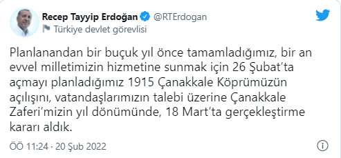 Cumhurbaşkanı Recep Tayyip Erdoğan, 26 Şubat'ta açılması planlanan 1915 Çanakkale Köprüsü'nün açılışını, Çanakkale Zaferi'nin yıl dönümünde, 18 Mart'ta gerçekleştirme kararı aldıklarını açıkladı.