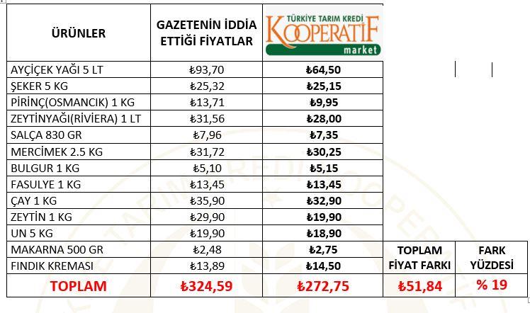 Yine bir başka günlük gazetede ise “FİYATLAR GAYET UYGUN DEĞİLMİŞ!” manşeti ile verilen haberde, Tarım Kredi Kooperatif Marketlerdeki fiyatların incelendiği belirtilerek, şirketimizin marketlerine ait olduğu iddia edilen fiyatlar üzerinden yanlış ve yanıltıcı bir haber yapılmıştır. İnternet sitemiz ve sosyal medya hesaplarımızdan da duyurduğumuz üzere belirtilen fiyatlar Tarım Kredi Kooperatif Marketlerin gerçek fiyatlarını yansıtmamaktadır. Gerçek fiyatlarımız aşağıda yer alan tabloda verilmiştir.