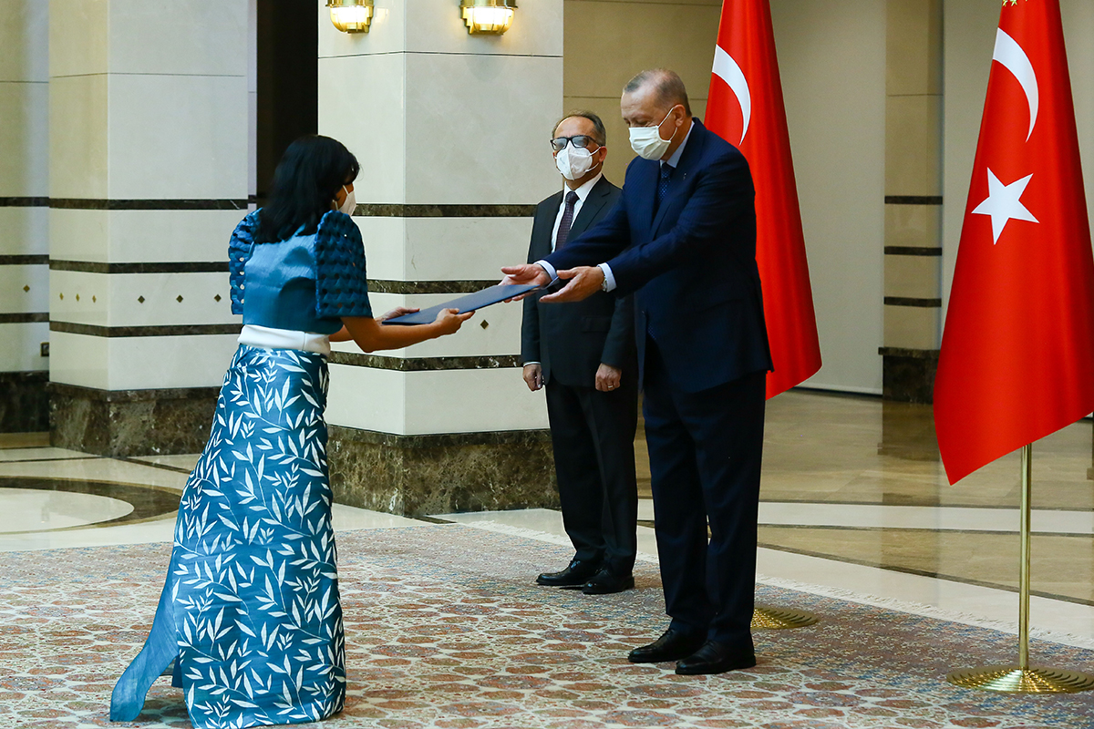Büyükelçi Algabre'nin bazı büyükelçilik mensuplarını Cumhurbaşkanı Erdoğan'a takdimi ve fotoğraf çekiminin ardından tören sona erdi.