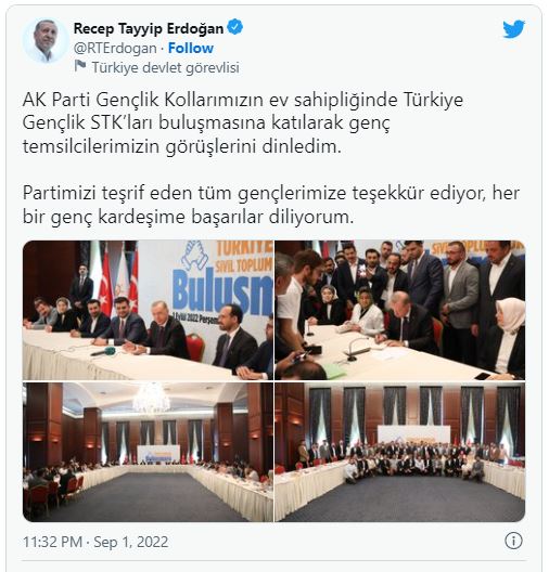 "AK Parti Gençlik Kollarımızın ev sahipliğinde Türkiye Gençlik STK'ları buluşmasına katılarak genç temsilcilerimizin görüşlerini dinledim. Partimizi teşrif eden tüm gençlerimize teşekkür ediyor, her bir genç kardeşime başarılar diliyorum." ifadelerini kullandı.