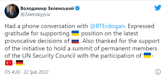 İletişim Başkanlığından yapılan açıklamada ise, "Cumhurbaşkanımız Erdoğan, Ukrayna Devlet Başkanı Zelensky ile telefonda görüştü. Görüşmede, Rusya'nın sözde Donetsk ve Luhansk Cumhuriyetlerini tanıma kararı ele alındı" denildi.