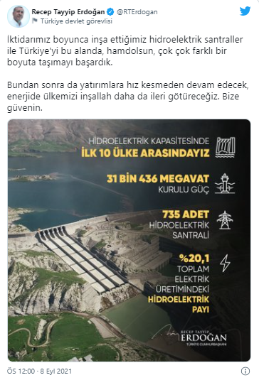 Ayrıca Erdoğan'ın paylaştığı görselde, "Hidroelektrik kapasitesinde ilk 10 ülke arasındayız. 31 bin 436 megavat kurulu güç, 735 adet hidroelektrik santrali, yüzde 20,1 toplam elektrik üretimindeki hidroelektrik payı" ifadeleri yer aldı.