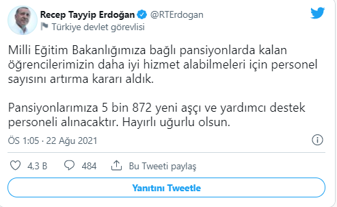 Cumhurbaşkanı Recep Tayyip Erdoğan, Twitter adresinden yaptığı paylaşımla, "Milli Eğitim Bakanlığımıza bağlı pansiyonlarda kalan öğrencilerimizin daha iyi hizmet alabilmeleri için personel sayısını artırma kararı aldık. Pansiyonlarımıza 5 bin 872 yeni aşçı ve yardımcı destek personeli alınacaktır. Hayırlı uğurlu olsun" dedi.