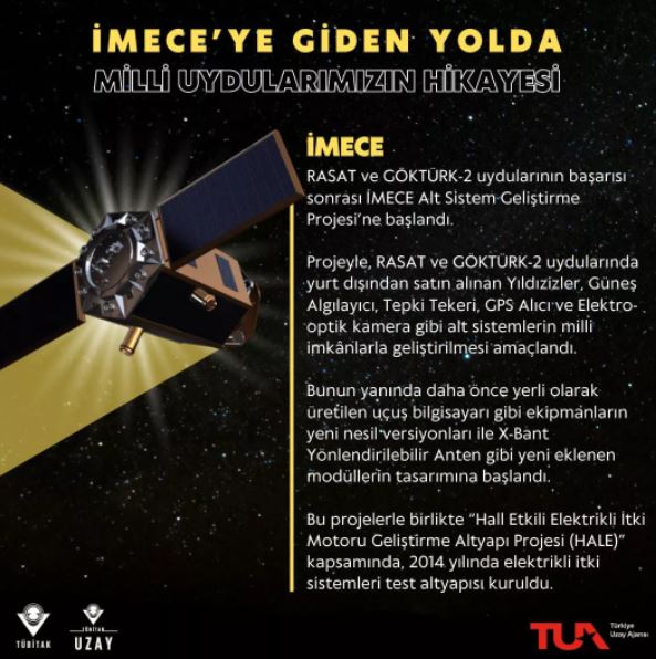 TÜBİTAK UZAY tarafından geliştirilen İMECE uydusunun yılın son çeyreğinde yer testlerini tamamlaması ve 15 Ocak 2023'te fırlatılması planlanıyor.