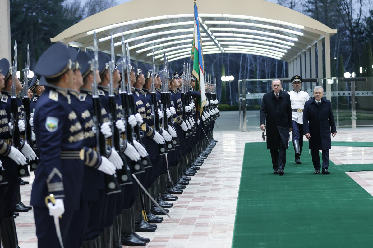 Erdoğan ilk durağı olan Bağımsızlık Anıtı'na çelenk bıraktı. Buradan Kok Sarayı'na gelen Erdoğan askeri törenle karşılandı. İki ülke marşlarının okunduğu törende Erdoğan askeri kıtayı selamladı. Törende daha sonra Erdoğan ve Mirziyovev'e karşılıklı heyetler tanıtıldı.