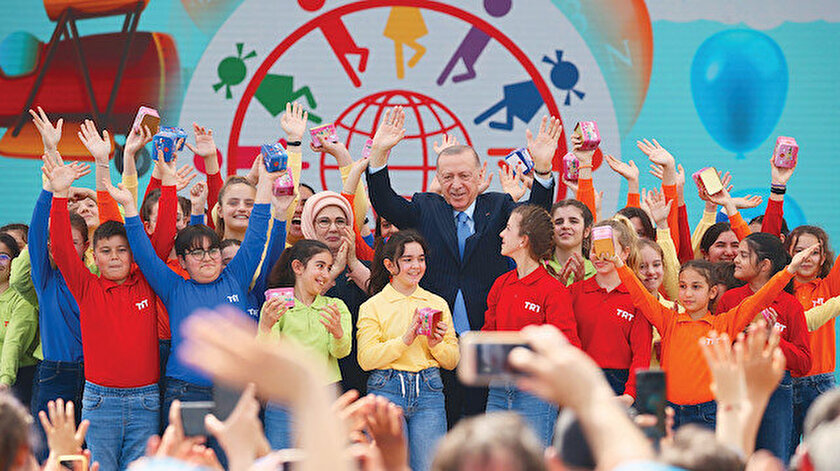 Cumhurbaşkanı Recep Tayyip Erdoğan, Başakşehir Millet Bahçesi’nde düzenlenen 23 Nisan TRT Çocuk Şenliği’ne katılarak “Evlatlarımızın her birinin gözlerinden öpüyorum. Buradaki evlatlarımızın nezdinde tüm milletimizin tüm çocukların 23 Nisan Mili Egemenlik ve Çocuk Bayramı’nı tebrik ediyorum” dedi. Yakın coğrafyadaki gelişmelere dikkati çekerek, bu bölgelerdeki çocuklar için derin bir üzüntü yaşadıklarını dile getiren Erdoğan, şöyle konuştu: “Güneyimizde on binlerce çocuğun hayatını yitirdiği, yüz binlerce çocuğun yetim öksüz kaldığı, on binlerce çocuğun Avrupa başta olmak üzere dünyanın dört bir yanında kaybolduğu bir trajedi hala sürüyor. Kuzeyimizde ikinci ayını bitiren savaşın da acı neticeler doğurarak devam etmesini endişe ile takip ediyoruz.”