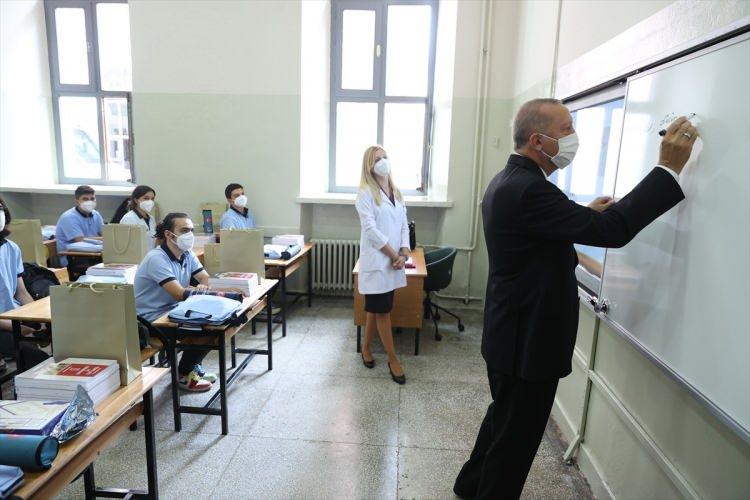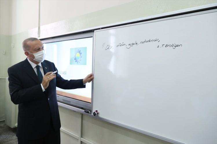Cumhurbaşkanı Erdoğan girdiği bir sınıfta tahtaya "Oku, düşün, uygula, neticelendir" yazdı.