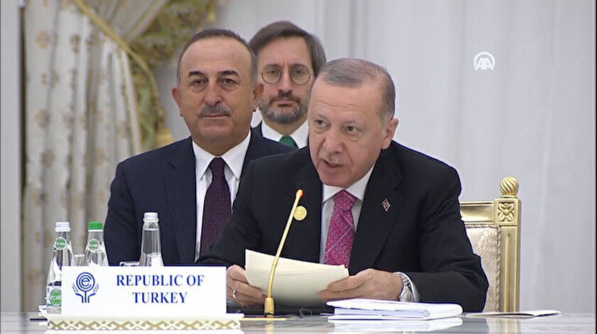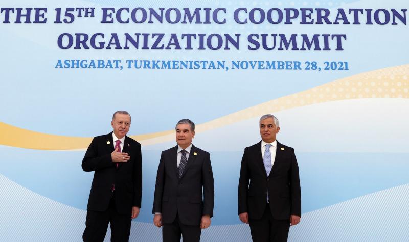 Türkmenistan’daki resmi ziyaretine devam eden Cumhurbaşkanı Recep Tayyip Erdoğan, Ekonomik İşbirliği Teşkilatı 15. Zirvesi’ne katıldı. Zirve öncesi liderle bir araya gelerek temaslarda bulunan Erdoğan, aile fotoğrafı çektirdi.
