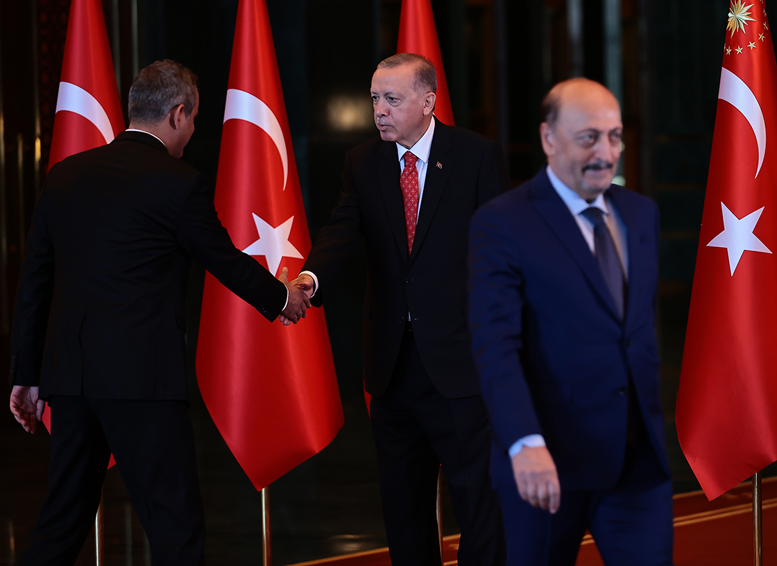Cumhurbaşkanlığı Külliyesi ana bina girişinde düzenlenen törende, TBMM Başkanı Mustafa Şentop, Cumhurbaşkanı Yardımcısı Fuat Oktay, Anayasa Mahkemesi Başkanı Zühtü Arslan, Yargıtay Başkanı Mehmet Akarca, Danıştay Başkanı Zeki Yiğit, Sayıştay Başkanı Metin Yener, Cumhurbaşkanlığı Kabinesi üyeleri, MHP Genel Başkanı Devlet Bahçeli, Genelkurmay Başkanı Orgeneral Yaşar Güler ve kuvvet komutanları, TBMM üyeleri, kamu kurumlarının yöneticilerinin de aralarında olduğu devlet erkanı, yabancı misyon şefleri ile uluslararası kuruluşların temsilcileri Cumhurbaşkanı Erdoğan'a bayram tebriklerini sundu.