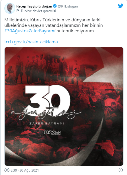 Milletin, Kıbrıs Türklerinin ve dünyanın farklı ülkelerinde yaşayan vatandaşların her birinin 30 Ağustos Zafer Bayramı'nı tebrik eden Cumhurbaşkanı Erdoğan, bu gurur gününde kendilerini yalnız bırakmayanlara, şahsı ve milleti adına teşekkürlerini sundu.