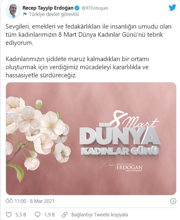 Sevgileri, emekleri ve fedakârlıkları ile insanlığın umudu olan tüm kadınlarımızın 8 Mart Dünya Kadınlar Günü’nü tebrik ediyorum. Kadınlarımızın şiddete maruz kalmadıkları bir ortamı oluşturmak için verdiğimiz mücadeleyi kararlılıkla ve hassasiyetle sürdüreceğiz.