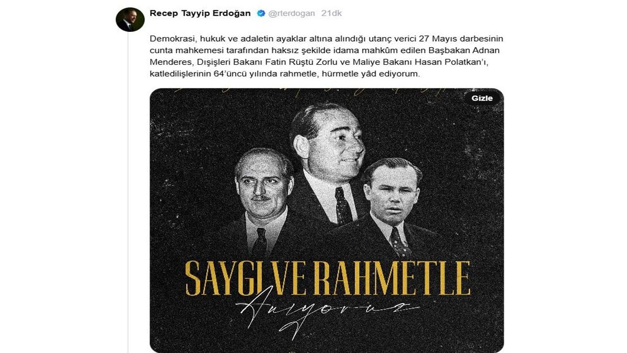 "Demokrasi, hukuk ve adaletin ayaklar altına alındığı utanç verici 27 Mayıs darbesinin cunta mahkemesi tarafından haksız şekilde idama mahkum edilen Başbakan Adnan Menderes, Dışişleri Bakanı Fatin Rüştü Zorlu ve Maliye Bakanı Hasan Polatkan’ı katledilişlerinin 64’üncü yılında rahmetle, hürmetle yad ediyorum."