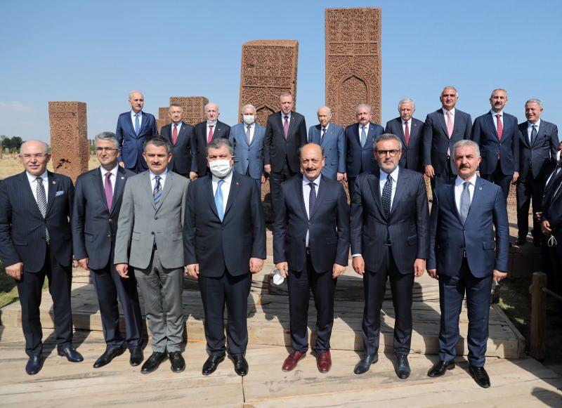 Muş'tan helikopterle Bitlis'in Ahlat ilçesine gelen Cumhurbaşkanı Recep Tayyip Erdoğan, ilçe merkezine yaklaşık 10 kilometre uzaklıkta bulunan etkinlik alanına geçmeden önce eşi Emine Erdoğan, MHP Lideri Devlet Bahçeli, Kültür ve Turizm Bakanı Mehmet Nuri Ersoy, Çevre ve Şehircilik Bakanı Murat Kurum, Sağlık Bakanı Fahrettin Koca, Adalet Bakanı Abdulhamit Gül, Milli Savunma Bakanı Hulusi Akar, Jandarma Genel Komutanı Orgeneral Arif Çetin, Emniyet Genel Müdürü Mehmet Aktaş ve Okçular Vakfı Genel Başkanı Haydar Ali Yıldız ile birlikte bölgenin en büyük Türk ve İslam mezarlığı olan Ahlat Selçuklu Meydan Mezarlığı'nı ziyaret etti. Yaklaşık yarım saat burada kalan Cumhurbaşkanı Erdoğan daha sonra beraberindekilerle çeşitli etkinliklerin düzenlendiği Çarho mevkisine geçti.