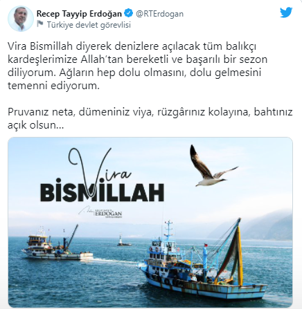 Cumhurbaşkanı Erdoğan, denizlerde av sezonun başlaması ile ilgili Twitter hesabından paylaşımda bulundu. Erdoğan, mesajında "Vira Bismillah' diyerek denizlere açılacak tüm balıkçı kardeşlerimize Allah’tan bereketli ve başarılı bir sezon diliyorum. Ağların hep dolu olmasını, dolu gelmesini temenni ediyorum. Pruvanız neta, dümeniniz viya, rüzgarınız kolayına, bahtınız açık olsun" ifadelerini kullandı.