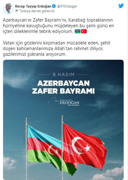 Cumhurbaşkanı Recep Tayyip Erdoğan, Azerbaycan'ın Karabağ'daki zaferinin birinci yıl dönümü nedeniyle sosyal medya hesabından açıklama yaptı.