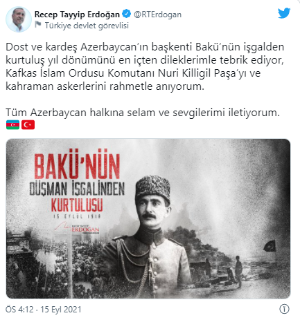 Cumhurbaşkanı Recep Tayyip Erdoğan, "Dost ve kardeş Azerbaycan’ın başkenti Bakü’nün işgalden kurtuluş yıl dönümünü en içten dileklerimle tebrik ediyor, Kafkas İslam Ordusu Komutanı Nuri Killigil Paşa’yı ve kahraman askerlerini rahmetle anıyorum. Tüm Azerbaycan halkına selam ve sevgilerimi iletiyorum." açıklamasında bulundu.