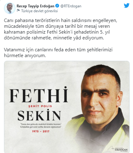 Cumhurbaşkanı Recep Tayyip Erdoğan, "Canı pahasına teröristlerin hain saldırısını engelleyen, mücadelesiyle tüm dünyaya tarihî bir mesaj veren kahraman polisimiz Fethi Sekin’i şehadetinin 5. yıl dönümünde rahmetle, minnetle yâd ediyorum.